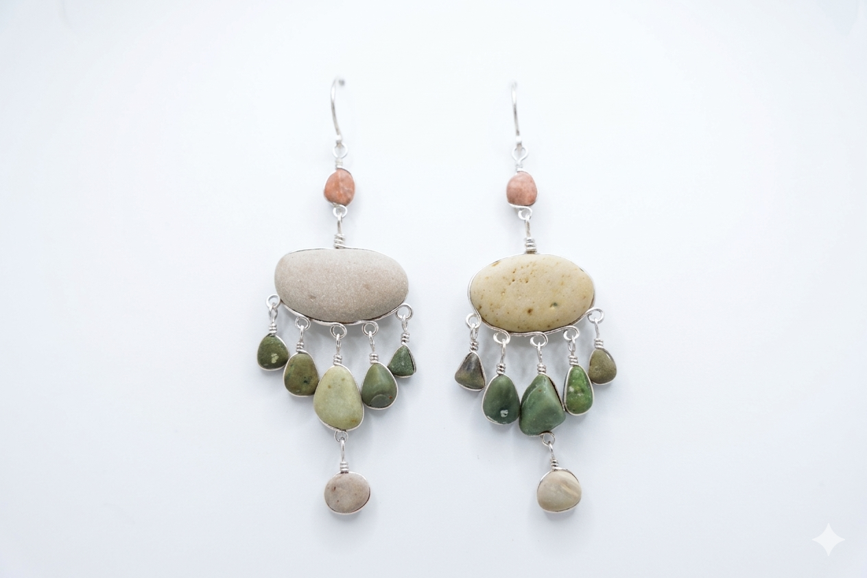 Este es nuestro modelo favorito, muy parecido al A7 Caulerpa. La diferencia es que tiene una pequña piedra redonda arriba, lo que le da más distnacia de la oreja, y la forma ovalada de la piedra principal. Este modelo combina las dos formas de piedra más recurrente en la zona intermareal, y esto permite combinar una impresionante variedad de tonos. Un modelo elegante que luce a todas, y con todo. Con un peso máximo de 4.5 gr por arete (en caso de piedra tamaño regular).
